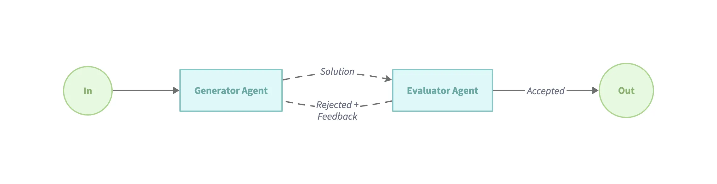 Section titled “模式 5:Evaluator-Optimizer(评估-优化模式)”该模式中,一个模型生成输出,另一个模型评估该输出并提供反馈,如同人类“先写后改”流程。 适用场景: