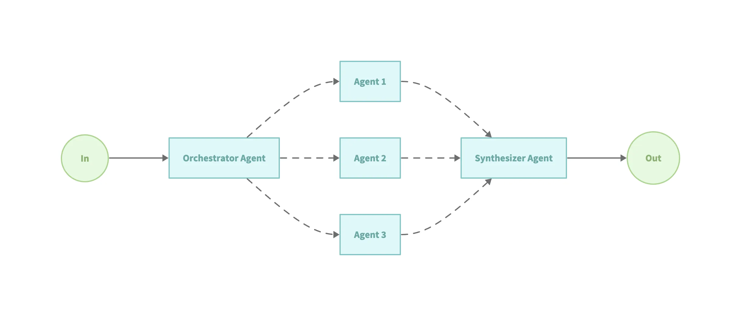 Section titled “模式 4:Orchestrator-Workers(编排-工作者模式)”这个模式结合了 “Agent” 倾向:一个中央 LLM 作任务分解(orchestrator),再由不同 “Worker” 执行子任务。